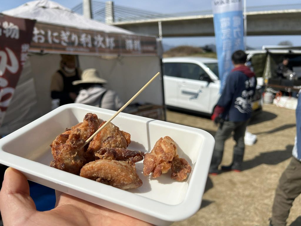 ごみ拾いのあとは、お楽しみのエコ屋台や企業ブース、各プログラムが行われました。電気自動車の電気を使い、リユース食器も活用されるなど、環境にやさしい工夫がされています。さらに凧揚げや野鳥観察、筏組み体験も行われ、河原にはエコな時間が流れていました。