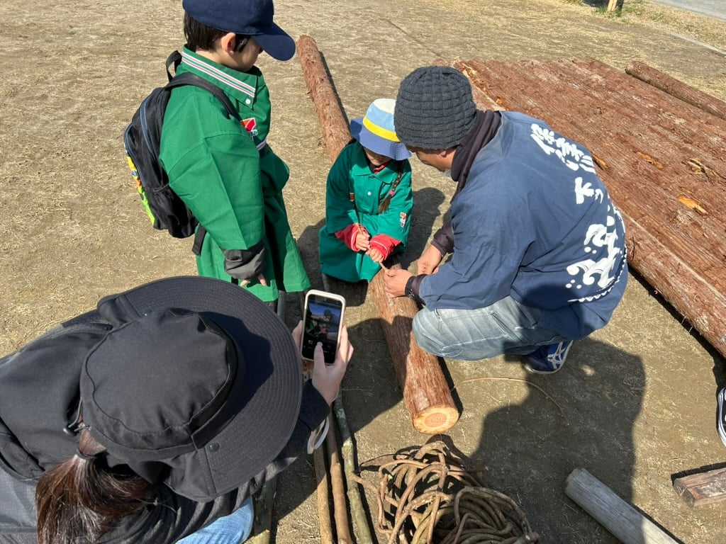 船頭さんの指導のもと、参加者は杉や樫の木を藤づるで固く結んでいきます。